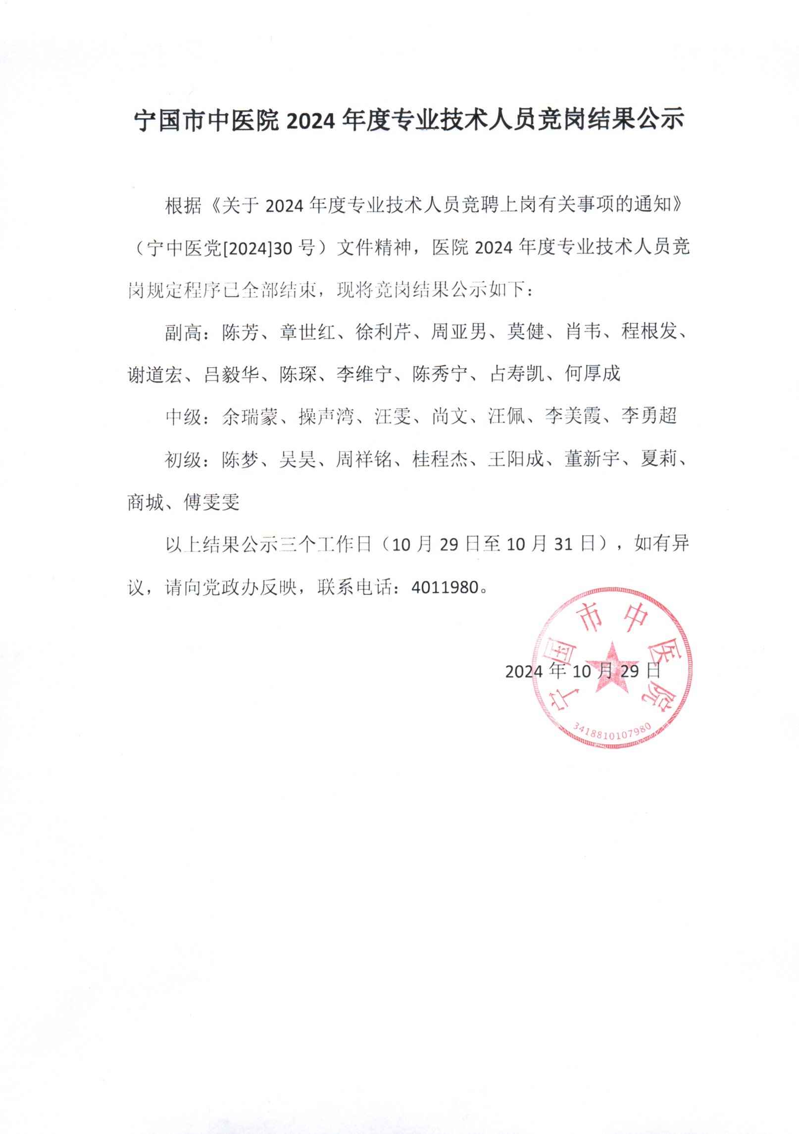 宁国市中医院 2024 年度专业技术人员竞岗结果公示