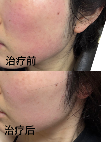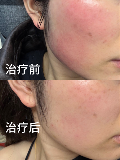 治疗前患者面部大面积红斑、丘疹密集分布,潮红、灼热感明显;4次疗程结束后,面部红斑基本消退,丘疹全部消失,皮肤恢复光洁状态,相关不适症状完全缓解。